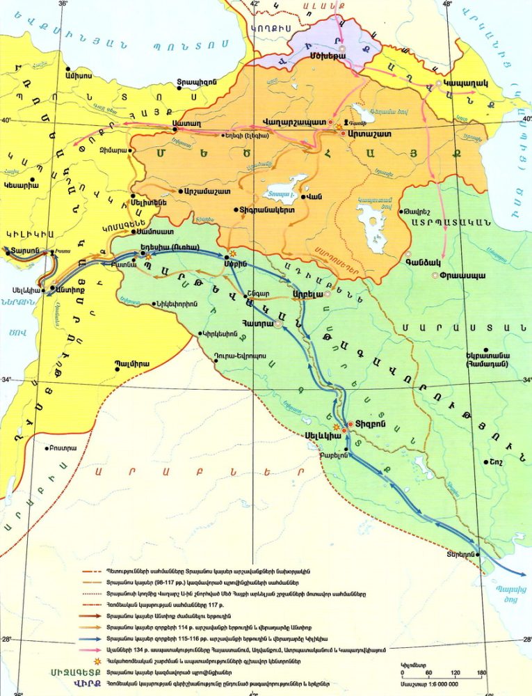 116 թ. Հայաստանում, Միջագետքում և Ադիաբենում ուժեղ ապստամբություններ բռնկվեցին հռոմեացիների դեմ։ Հայաստանում համառ կռիվներում հռոմեական զորքերը պարտվեցին հայ-պարթեական միացյալ ուժերից։ Տրայանոսը իր թիկունքը վտանգված տեսնելով՝ Միջագետքում փորձեց դաժան կերպով ճնշել այստեղ առաջացած ապստամբությունները:
